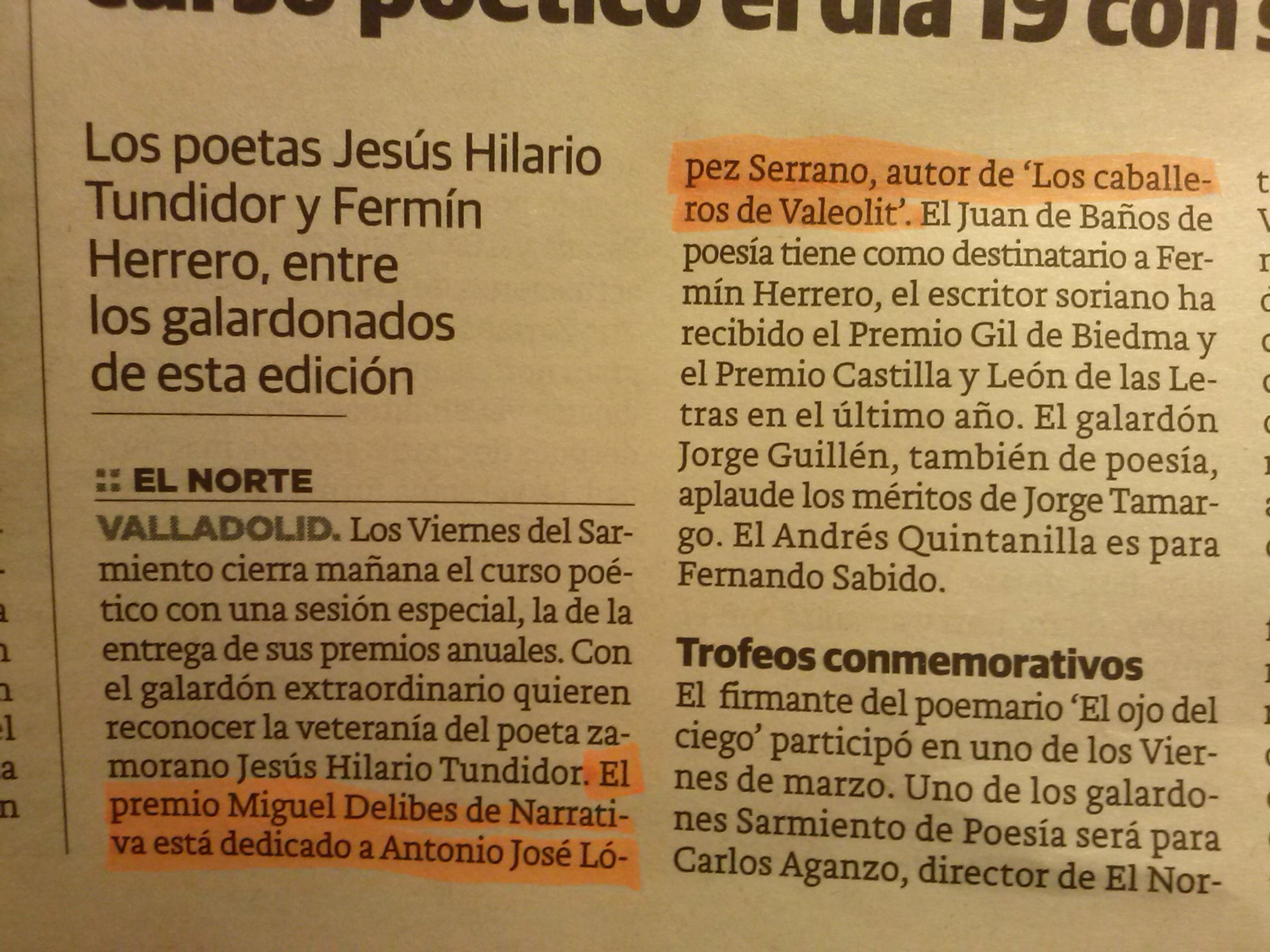 Os dejo la noticia completa que venía en el NORTE DE CASTILLA el día 11 de junio con los Premios otorgados a todos los poetas. En los próximos días supongo que saldremos un poquito más.