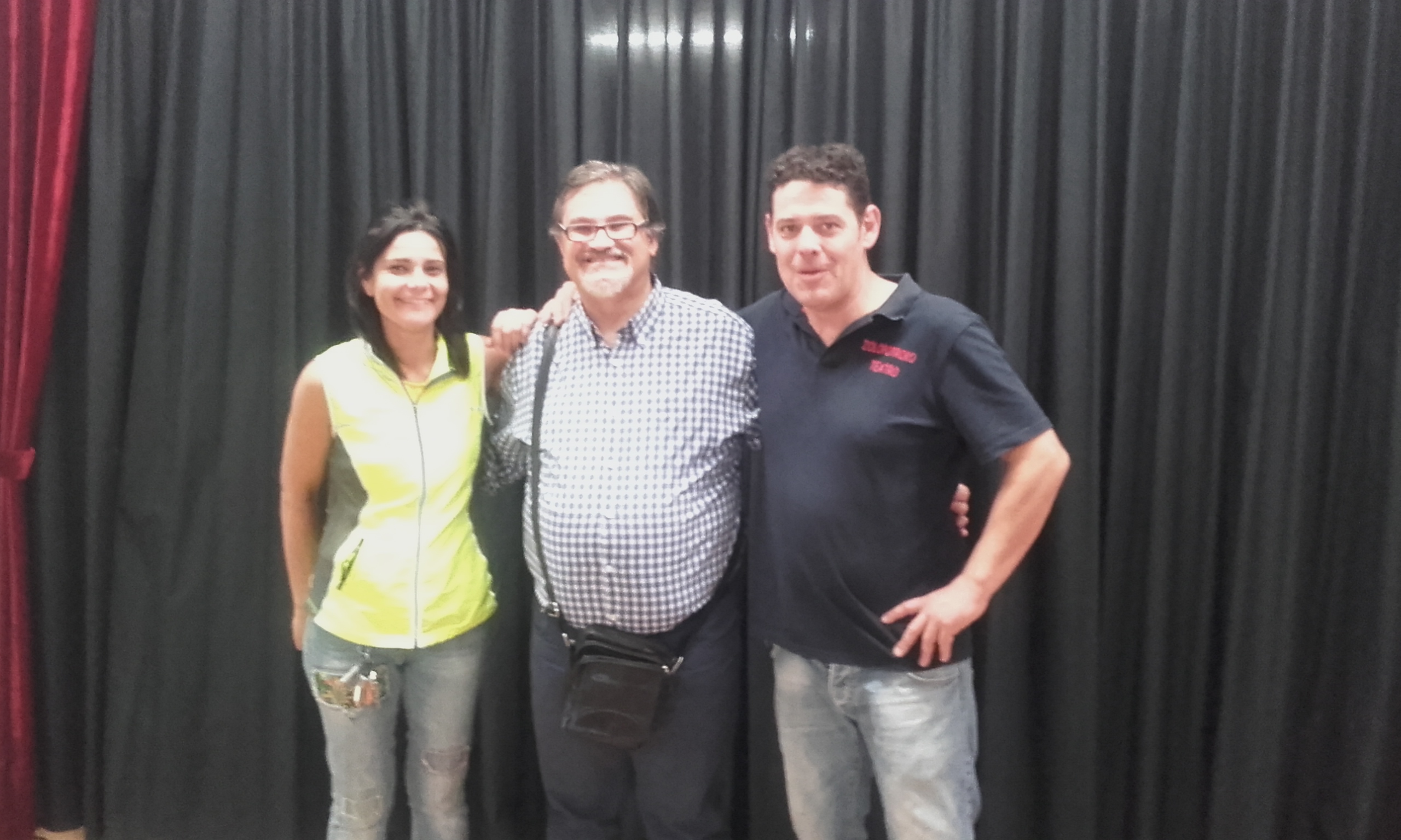 De las tres fotos, me parece que esta es la que estamos mejor, a pesar del fluorescente del fondo, y del rictus de Julio Martín. Os los presento. ZOLOPOTROKO TEATRO. Gente que lo hace muy bien, y que trata de sacarse las castañas del fuego haciendo teatro. Buen teatro.