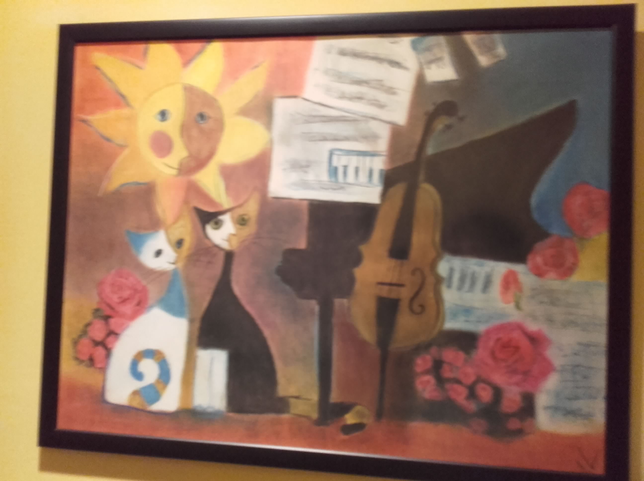 Arriba. Cuadro original de los gatos. Fue el primero que hice. Era una copia para aprender la técnica de las cretas. Me orientó Elena Benayas, que es la pintora que me ha enseñado a pintar con cretas.
