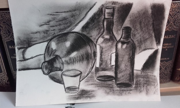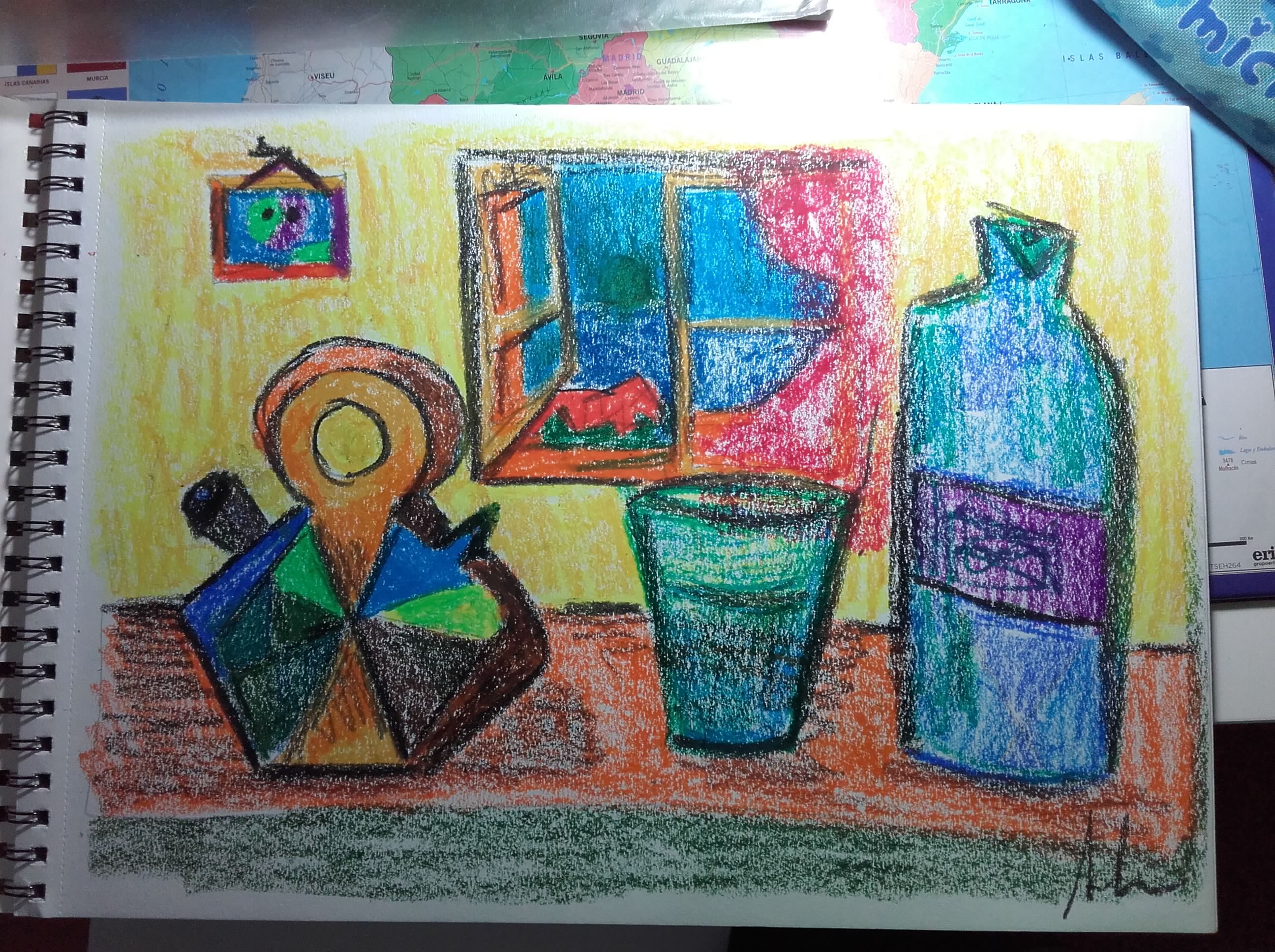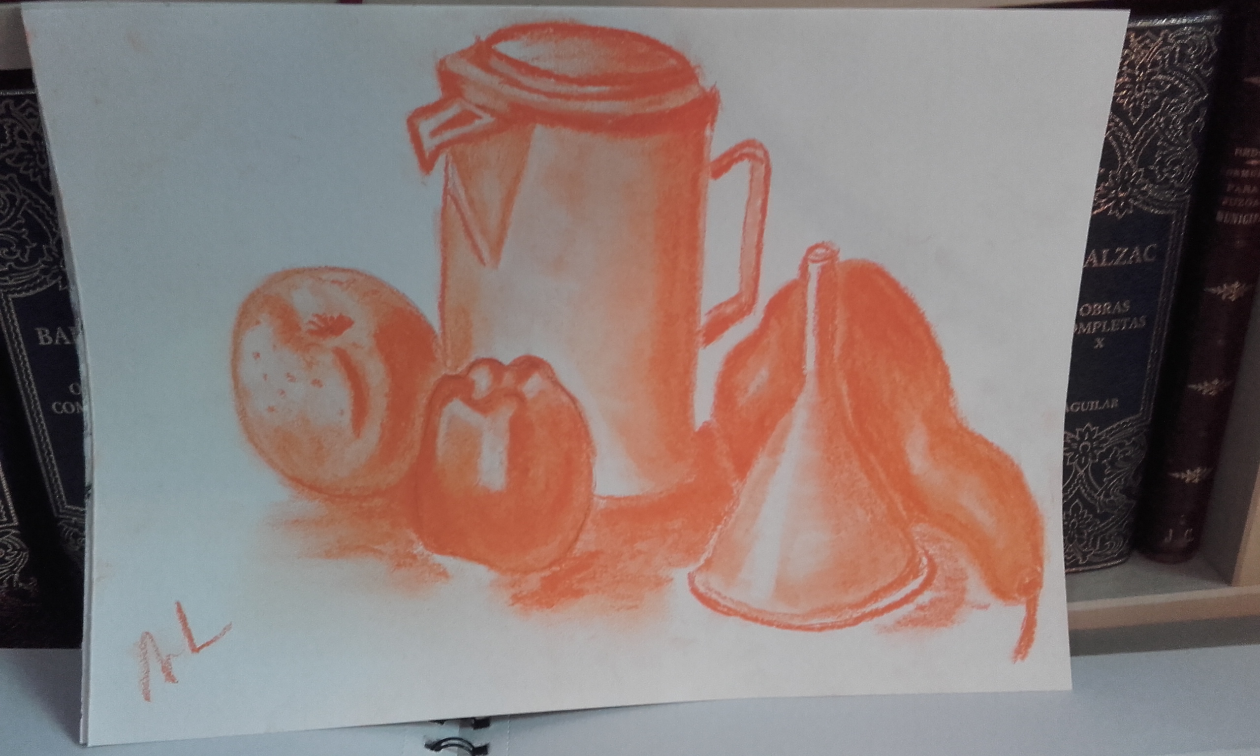 Arriba: copia de bodegón que encontré en un libro de aprender a pintar. Usé el color naranja porque estaba probando colores en casa. Bien. Entretenido. Si pasa a la historia de la pintura será porque le ponga otra firma, una que diga: Dalí.