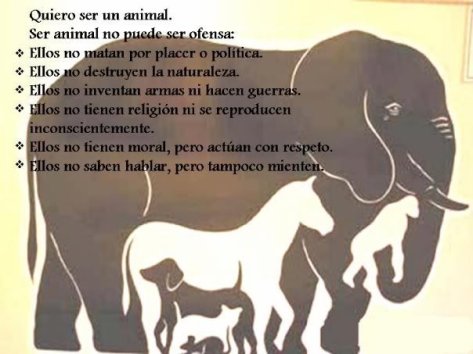 Una de esas consignas es la ideología animalistas con sus múltiples y diferentes variantes: veganos, naturalistas, nudistas, vegetarianos, postnudistas alopécicos, new age, etc. Su punto de partida y su raíz primaria para una construcción racional podría ser el ecologismo espiritualista, que entiende la naturaleza como una hermandad, vinculándose con algunas ramas del budismo. En esta idea, algunos animalistas confiesan ser parientes casi cercanos de los monos, los mamíferos y las medusas, y cualquier maltrato a los animales debe ser castigado como si fuera maltratado un ser humano. En el paroxismo terminan afirmando que hay que proteger a los animales y castigar y perseguir a los hombres, o que los hombres son peores, como reza la imagen que he escogido en esta entrada.
