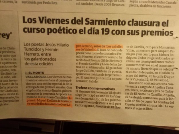 Yo, en aquel extraño grupo, era el de la narrativa, por lo que decidí no improvisar más versos sueltos de los convenientes. Era mi primer premio, y para Tundidor, quizás uno de los últimos. El poeta zamorano había recibido ya por entonces el Premio Castilla y León de las letras, creo que en el 2012; y recogía con nosotros el reconocimientos a toda una vida desgranando versos. El hombres estaba estupendamente, hablaba, preguntaba y escudriñaba el saber con la afabilidad del que busca la belleza en todos los rincones de la vida. Me pareció un hombre extraordinario. Amable y dulce, fuerte y cálido, sensible y poeta. Una gran persona, un hombre lleno de vida y de fuerza, cuya pérdida deja un hueco en los amantes de la poesía.